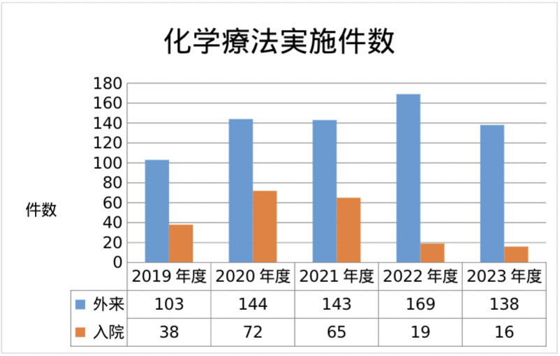 外来化学療法件数は増加傾向で、入院での治療件数は減少傾向を認めており、本来の治療概念である、日常生活を維持しながら外来通院にて治療を継続するケースが増えてきました。